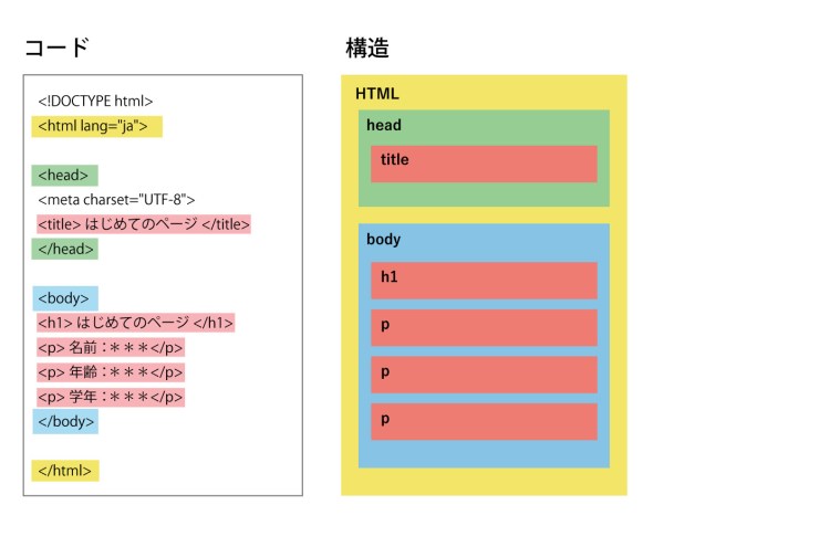 <!DOCTYPE html> <html lang="ja"> <head> <meta charset="UTF-8"> <title>はじめてのページ</title> </head> <body> <h1>はじめてのページ</h1> <p>名前:***</p> <p>年齢:***</p> <p>学年:***</p> </body> </html>