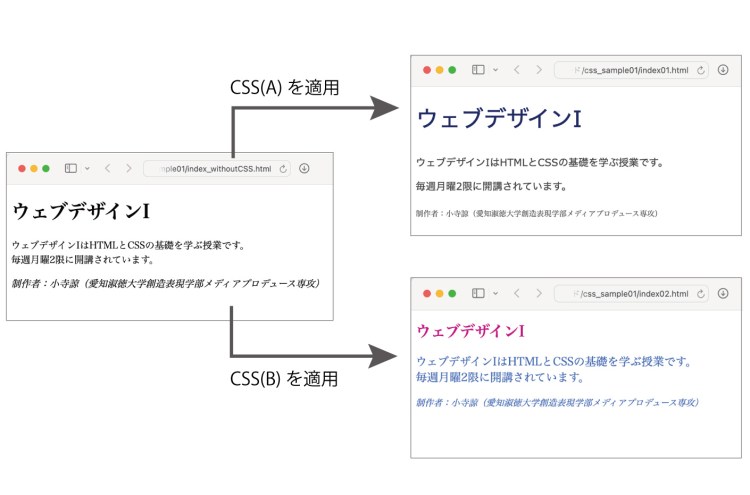 CSSを用いることで、HTMLの中身(文書構造)はそのままに、レイアウトなど外見を簡単に変えることができ、サイト制作を効率化できる。